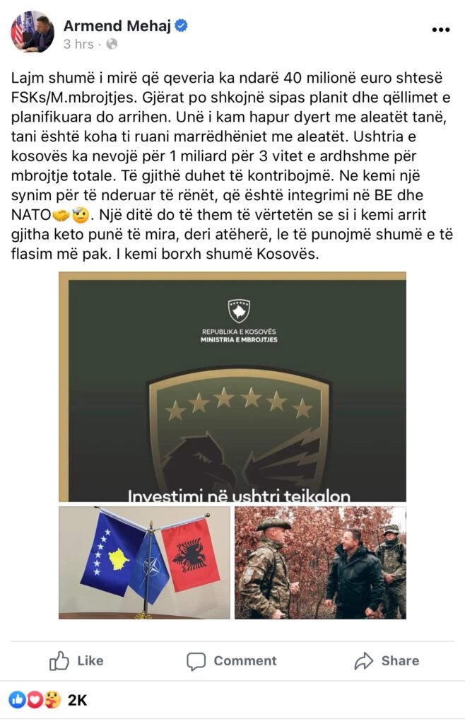 “Lajm shumë i mirë që qeveria ka ndarë 40 milionë euro shtesë FSKs/mbrojtje. Gjërat po shkojnë sipas planit dhe qëllimet e planifikuara do arrihen. Unë i kam hapur dyert me aleatët tanë, tani është koha ti ruani marrëdhëniet me aleatët. Ushtria e kosovës ka nevojë për 1 miliard për 3 vitet e ardhshme për mbrojtje totale. Të gjithë duhet të kontribuojmë”, ka shkruar Mehaj.