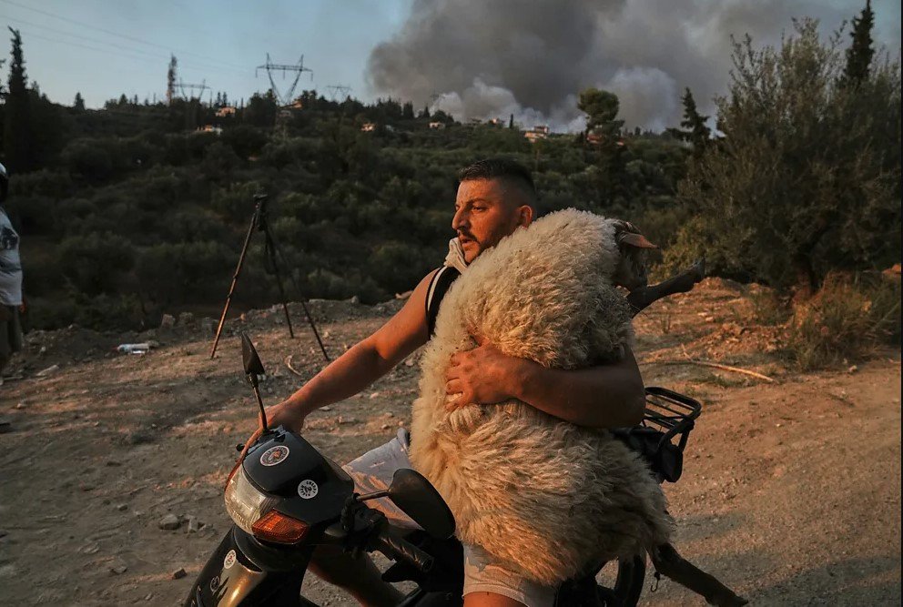 Fotografia është shkrepur nga Thanasis Stavrakis, fotoreporter i agjencisë Reuters, dhe tregon 33-vjeçarin shqiptar Oslien Muçobega teksa shpëton një dele nga flakët në zonën e Patrës. Ai e transporton kafshën mbi motor, duke kaluar përmes tymit dhe zjarrit.