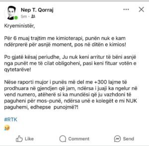 Nep Qorraj, e cila punon në RTK dhe po përballet me një sëmundje të rëndë, në një reagim prekës, ku thotë se megjithë trajtimin me kimioterapi, për gjashtë muaj nuk e ka ndërprerë kurrë punën, përveç në ditën e trajtimit.